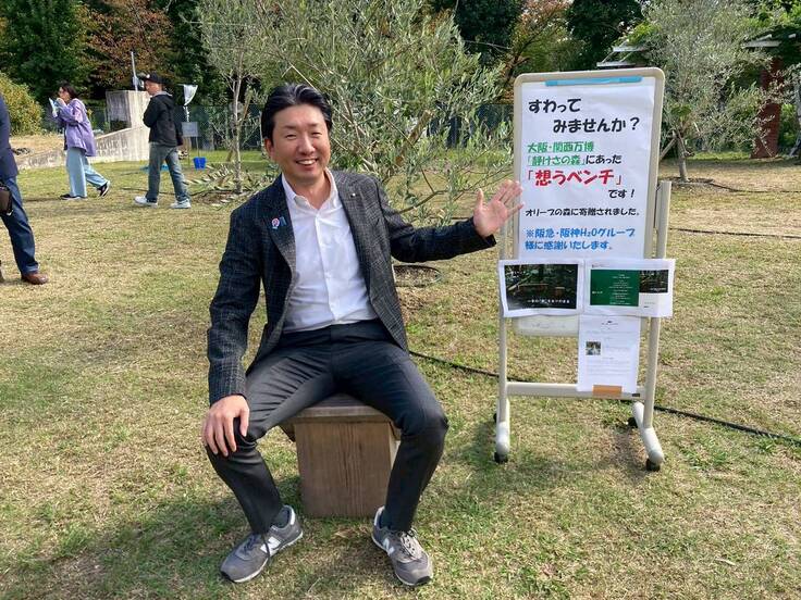 万博で活躍した「想うベンチ」もH2Oリテーリング様よりいただき,みなさんにも座ってもらいました。堺市長なども来てくれました。
