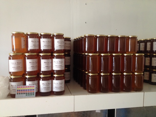 左:百花蜜 右:まだラベルを貼られていないのがシャテニエ(栗)のハチミツ。