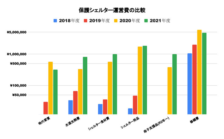 相談や活動の幅が広がり、より多くの方の困難に寄り添えるようになった一方で、団体を運営していくコストも年々増えております。2020年度から大幅に保護シェルターの運営費が増加し、2021年もさらに増加している状況です。