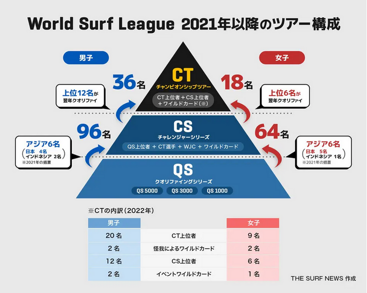 サーファーが参加し、世界チャンピオンを決定するチャンピオンシップツアー(CT)や、