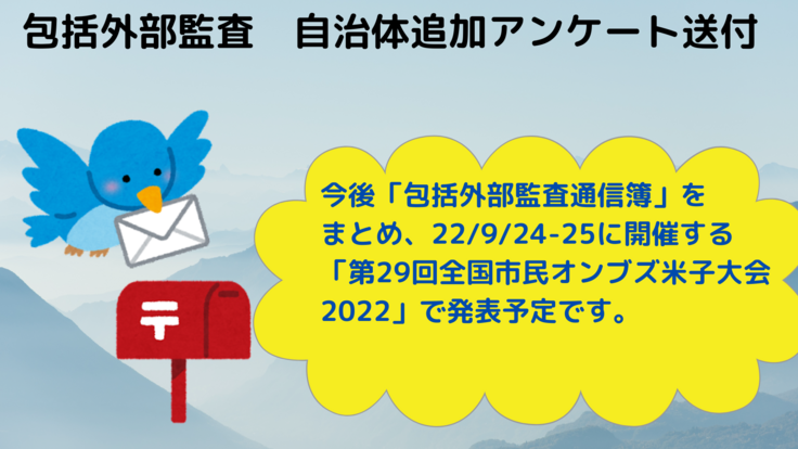 全国市民オンブズマン連絡会議 包括外部監査評価班は、「2022年版 包括外部監査の通信簿」の作成のため、「令和3年度 包括外部監査 自治体追加アンケート」を22/7/26に各自治体にメールで送付しました。