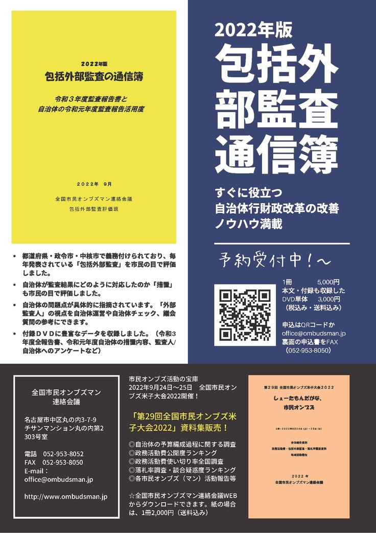 22/9/24-25に開催する、第29回全国市民オンブズ米子大会2022の資料(2,000円)も予約受付中です。