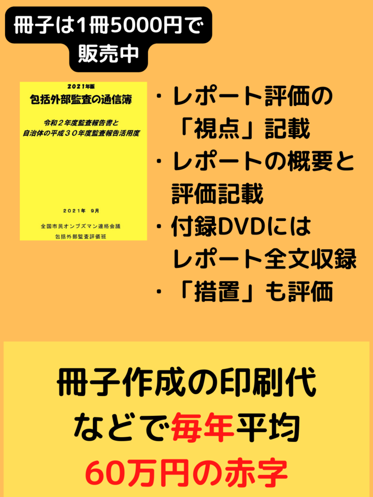「包括外部監査の通信簿」は、役所の無駄遣いを専門家が平均約1300万円かけてチェックする「包括外部監査」レポートを、市民オンブズマン側の専門家が出来不出来をチェックして通信簿冊子を作るものです。これによりレポートの質は向上し、各地の自治体の問題点があぶりだされています。しかし、毎年約60万円ほど赤字が出ており、今回も広く支援を募集します(9回目)。