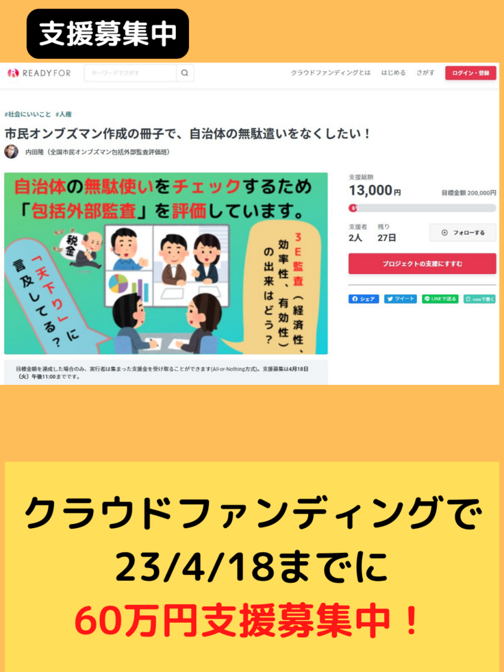 今回行うクラウドファンディングとはインターネット上で広く支援を募集する仕組みで、全国市民オンブズマン連絡会議が毎年作成している「包括外部監査の通信簿」の印刷費用としてready forでは20万円を募集することにしました。