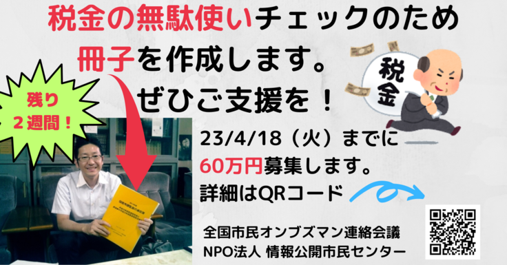 過去の支援者や市民オンブズマン関係者、ネットでの呼びかけやチラシ配布などにより、支援募集開始20日でready forでの支援総額が4名の方から目標金額20万円の18%,36,000円を集める事ができました。