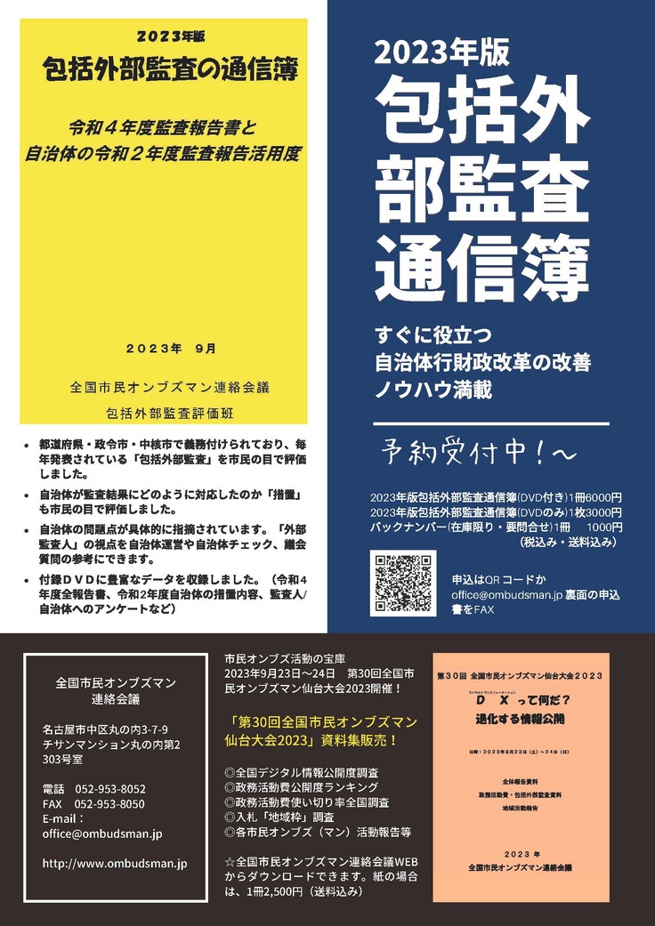 なお、包括外部監査の通信簿のバックナンバーは1,000円に値下げしました(在庫限り、2023年11月上旬まで受け付け)。