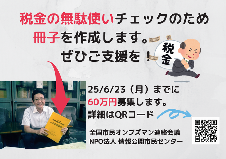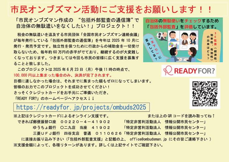 全国市民オンブズマン連絡会議は、2025年5月23日(金)13時から【市民オンブズマン作成の“包括外部監査の通信簿”で、自治体の無駄遣いをなくしたい!】支援募集を始めました。