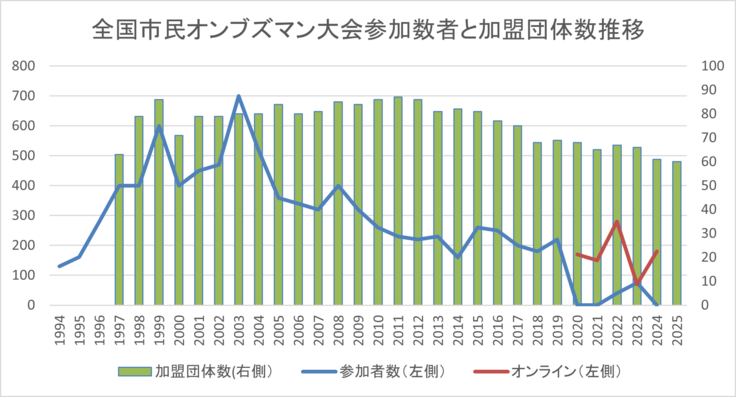 ・全国大会参加者数の推移:ピーク2003年700名 → 2024年180名(現地0、オンライン180)(-74%)