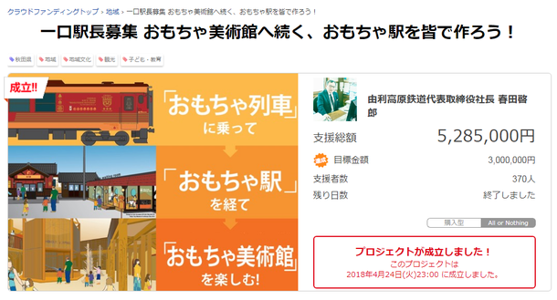 2月1日から始まりましたプロジェクト「一口駅長募集!おもちゃ美術館へ続くおもちゃ駅をみんなで作ろう」が4月24日23時で終了しました。