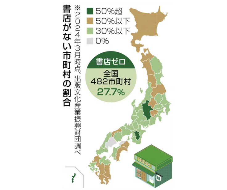 書店がない自治体は全国で27.7%にも及び、沖縄(56.1%)、長野(53.2%)、奈良(51.3%)の3県では過半数を占めています。