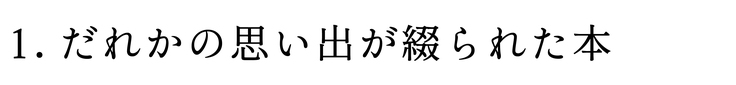 はじめまして、こんにちは。思い出書店と申します。 思い出書店では、「"だれか"の思い出が詰まった本」を取り扱っております。 思い出を通じて、本が行き交う古本屋さんです。 当店には様々な種類の本が並んでいますが、その全てにお揃いの帯が巻かれています。この帯たちには、かつてこの本の持ち主だった "だれかの思い出" が。 その思い出は、個人的で、ささやかで、儚くて、時には歪でありながら、 どの古本にもそっと、必ず添えられているのです。 思い出が添えられた不思議な古本。そんな本を思い出書店では、取り揃えております。