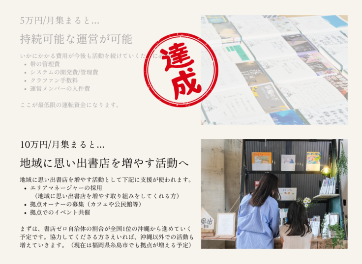 ご支援いただいた資金をもとに、書店ゼロ自治体の割合が全国1位である沖縄から活動を開始し、県内外問わず各地で拠点オーナーを増やす活動を行ってまいります。