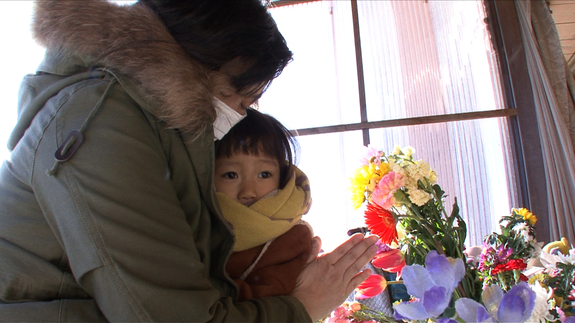 (祭壇に手を合わせる遺族/福島県南相馬市(2015年3月))