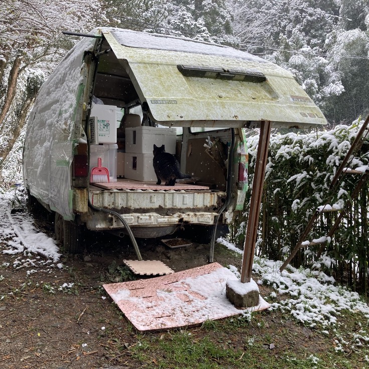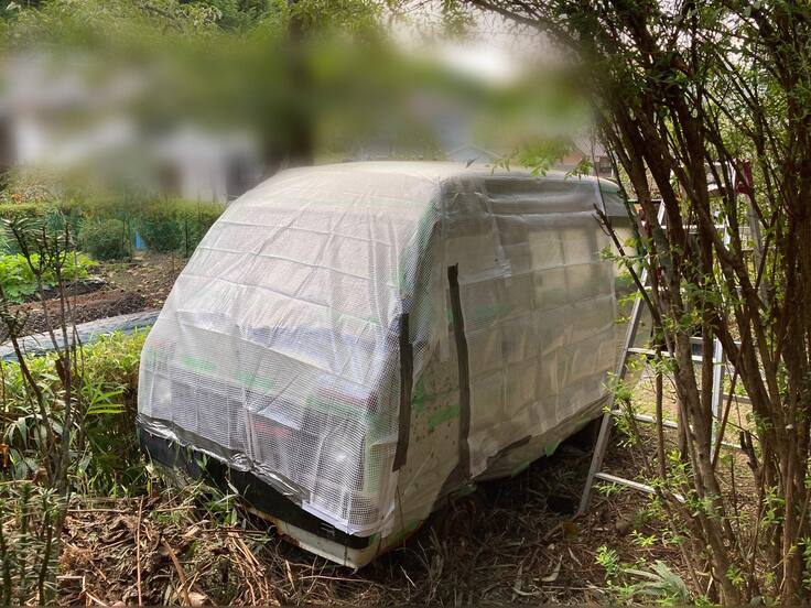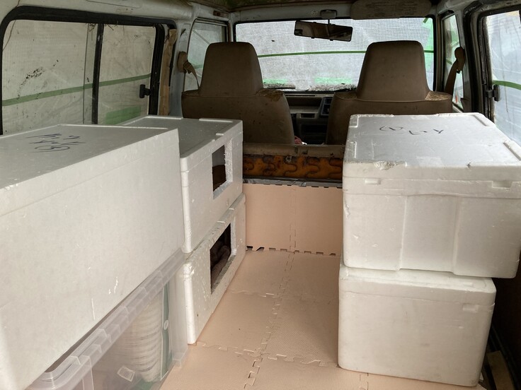 雨漏りがしていたので防水シートで覆い、中には発泡スチロールを利用して個室を設置しました。運転席と助手席は囲われるのが嫌な子用に温かいベッドを置いています。
