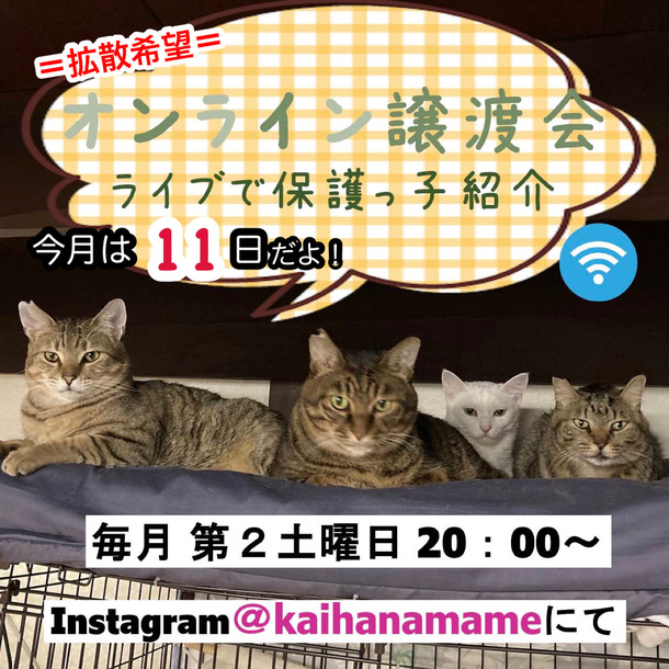 いつも告知がギリギリになってしまっておりますが、本日夜8時より月に一度のオンライン譲渡会を開催いたします。
