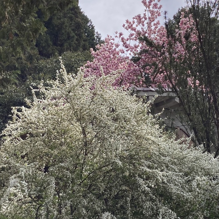 お家の手前の雪柳,、そしてお家の向こう側の高い木にはモクレンが満開です。