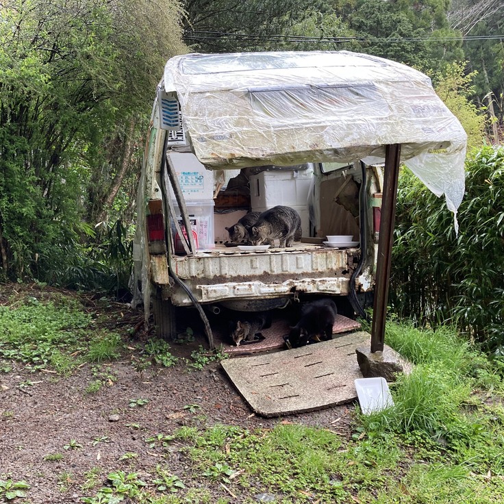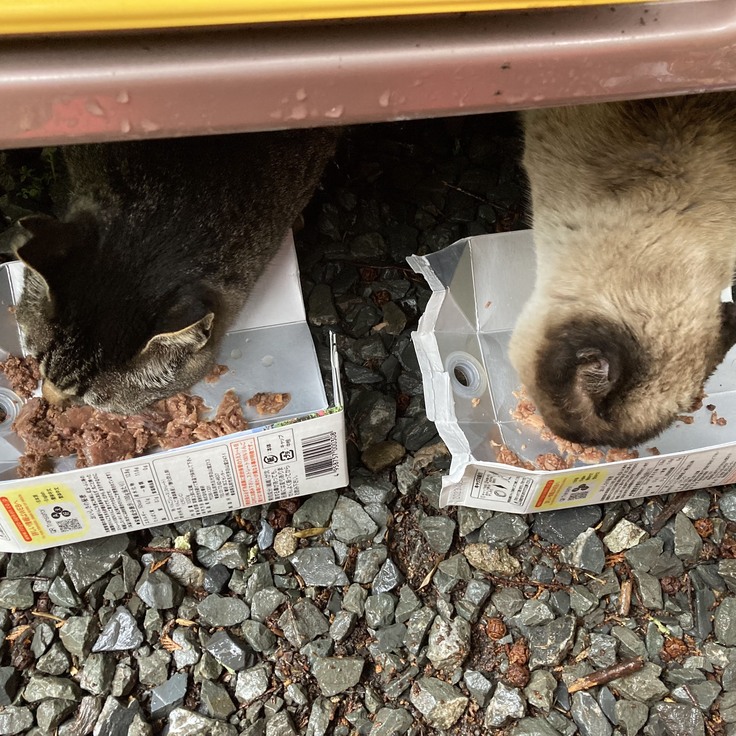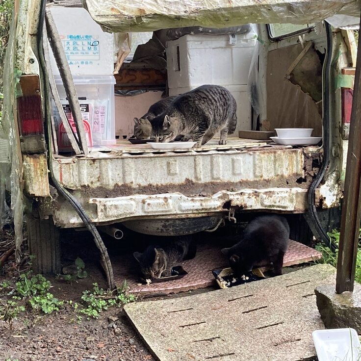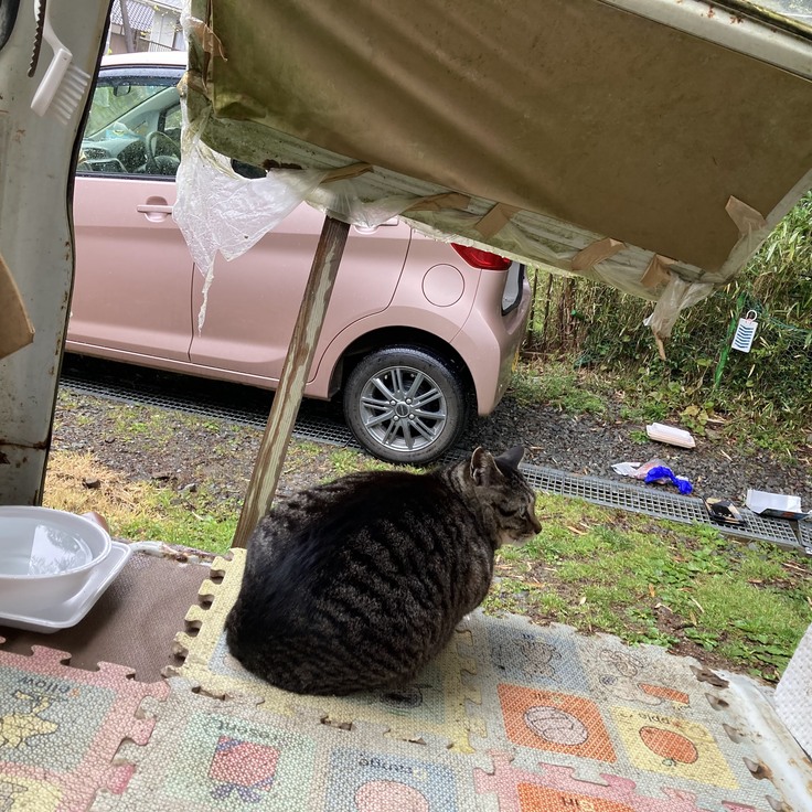 いつも食べているところは屋根がないので、雨が降った時は猫ホテルの中や下、私の車の下に別れて朝ごはんです。