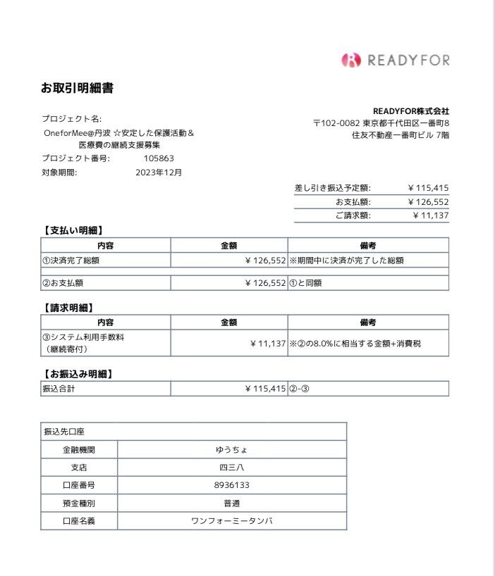 大変遅くなりましたが、1月25日にREADYFOR様よりお振込みいただきました