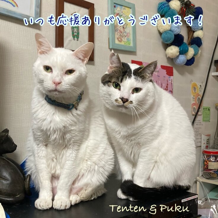 写真はお部屋で一番暖かい人気の場所を陣取る てんてん と ぷくちゃん の白猫コンビです。