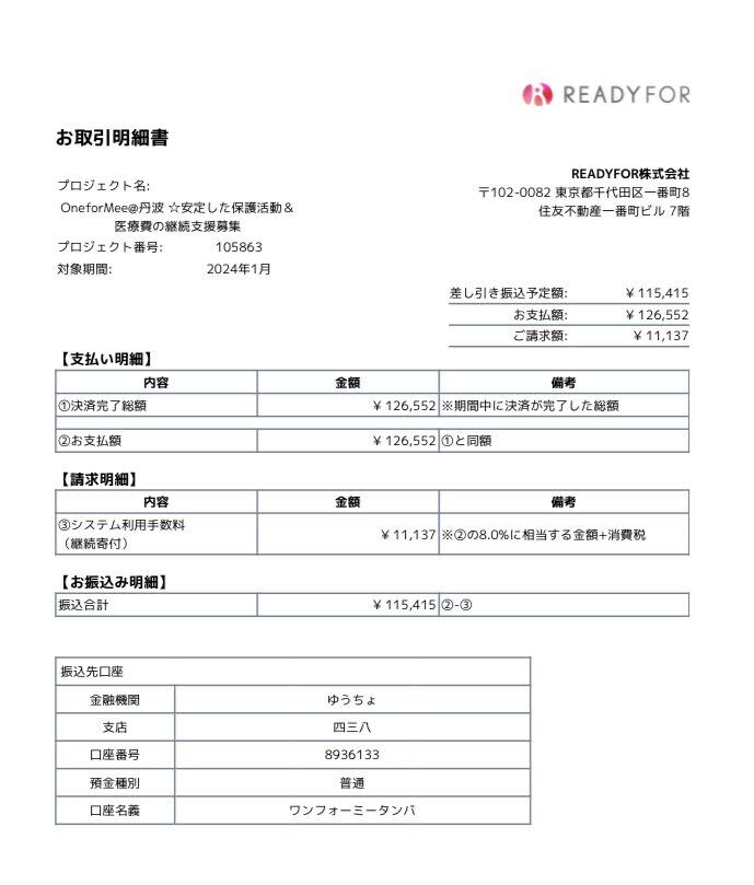 大変遅くなりましたが、2月25日にREADYFOR様よりお振込みいただきました