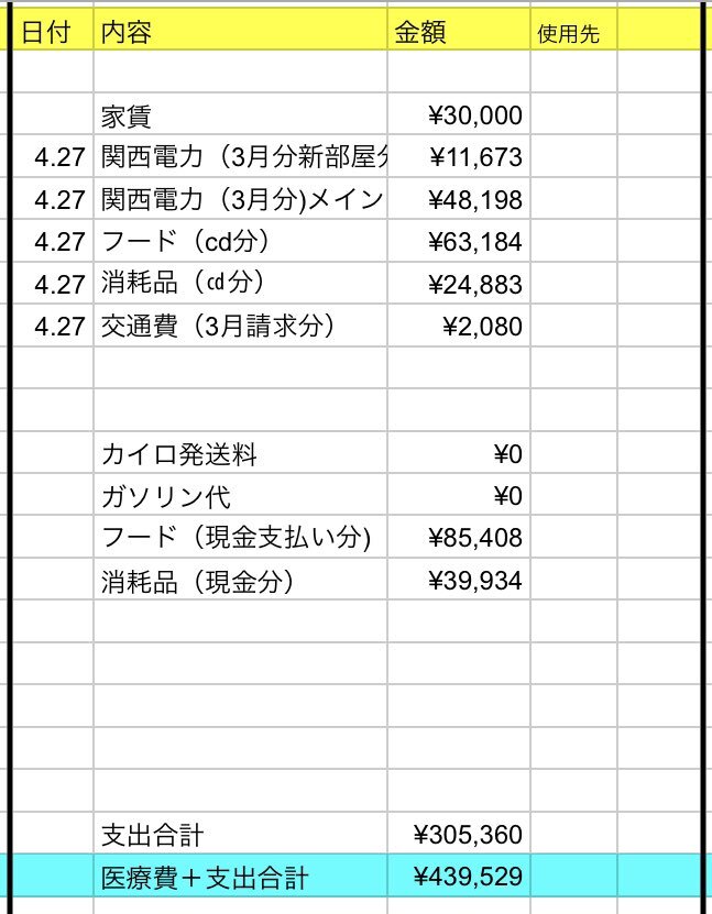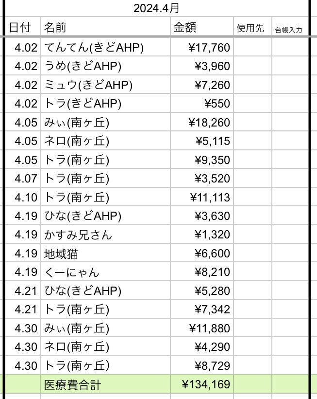 4月は、トラくんの膀胱炎と尿路結石での度重なる通院をはじめ、ひなちゃんの腎不全での体調不良や毎月医療が必要な子たちの治療やお薬など14匹の猫たちに ¥134,169 もの医療費がかかりました。