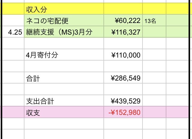 またまた遅くなってしまいましたが、みなさまにご支援いただきました3月の継続寄付分のご報告と4月の収支報告をさせていただきます。