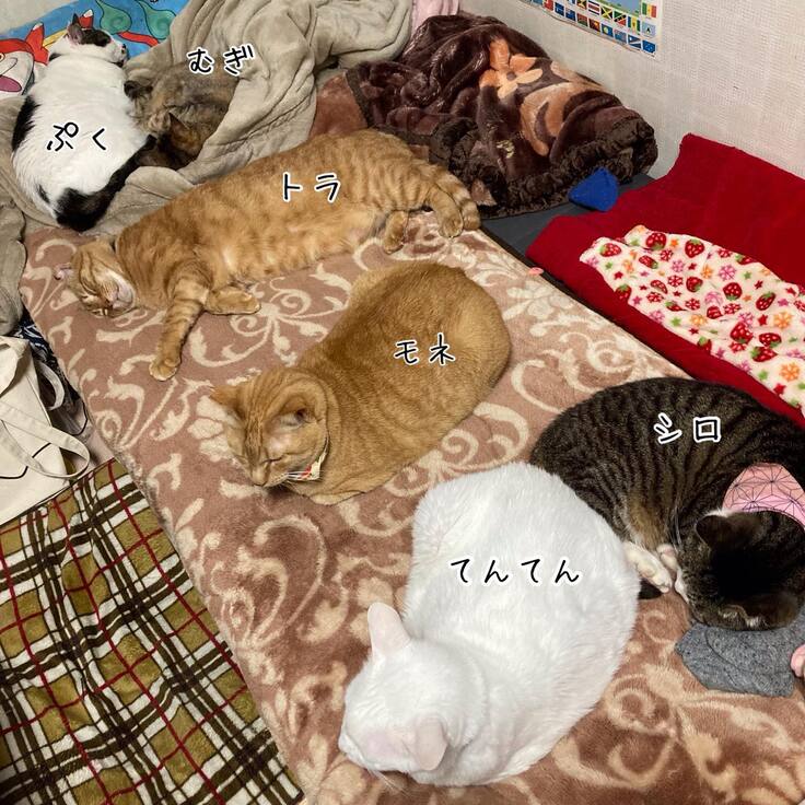 どうしてもおしっこされるので被害を最小限にできるよう敷布団は幅60センチのものを使用しているのですが、人間が寝たいところにみなさん陣取っておられるので私が猫たちのために敷いた複数のブランケットやベッドのボコボコなったうえで寝る羽目に…