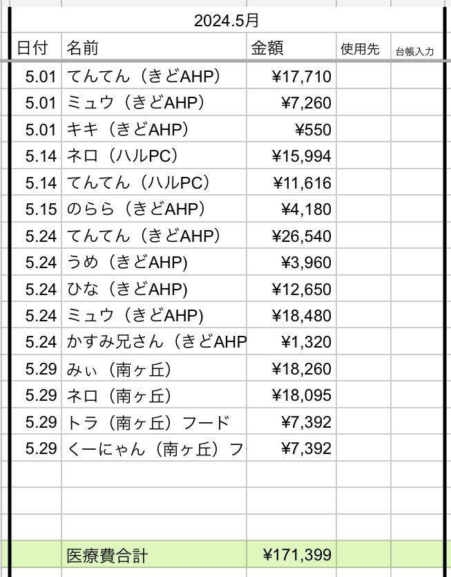 5月は、てんてんの口内炎や慢性鼻炎での通院、ひなちゃんの腎不全での通院や検査、ミュウちゃんの甲状腺機能亢進症の検査、みぃちゃんとネロちゃんの心臓の検査、てんてんとネロちゃんの漢方薬治療の開始、毎月医療が必要な子たちの治療やお薬、療法食など11匹の猫たちに ¥171,399 もの医療費がかかりました。