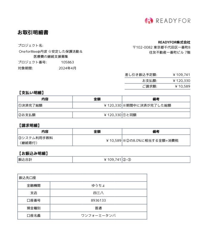 5月25日にレディーフォーさまより4月分の継続寄付分をお振込みいただきました。