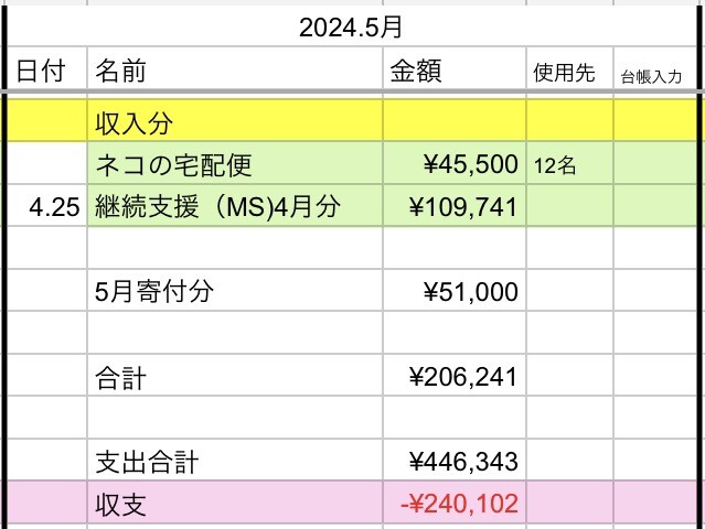 収入額 206,241円 - 支出額 446,343円 = -240,102円