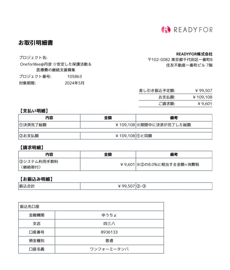 6月25日にレディーフォーさまより5月分の継続寄付分をお振込みいただきました。