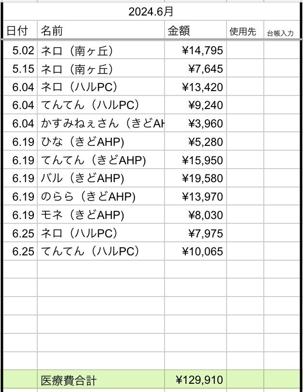 6月は7匹の子たちに、¥129,910 の医療費がかかりました。