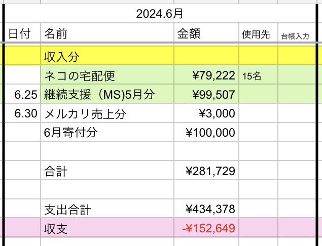 ※5月にInstagramにて開催させていただきましたムレスナティーで猫助けでの収入は集計がまだ出来ておりませんので来月に回させていただきます。