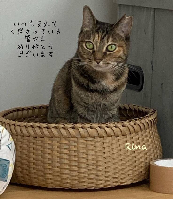最初の写真は、猫たちのために同じように頑張っておられるお隣の市のボランティアさんが編んでくださったカゴに入るリーナです。