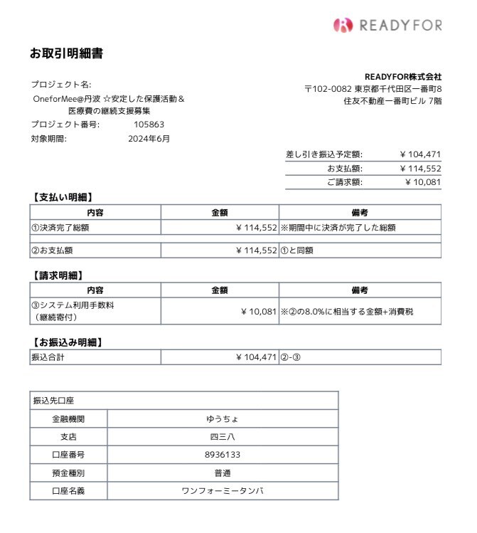 ※7月にInstagramにて開催していただきました「海豆ファミリー猫助けチャリティー」での収入は収支が間に合わなかったので来月に回させていただきます。