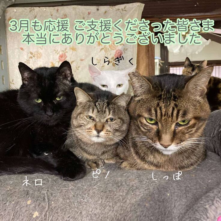 以上、3月は継続して医療が必要な子たち、崩壊現場から保護してきたシャムちゃん、急な疾患などで9匹の子たちに、¥140,360 の医療費がかかりました。