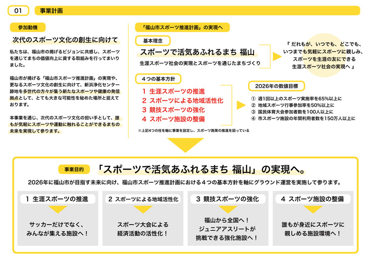 私たちは、福山市の掲げるビジョンに共感し、スポーツを通じてまちの価値向上に資する取組みを行ってまいりました。さらに「スポーツで活気あふれるまち 福山」を実現させるためには、市民の皆さまがスポーツをより身近に楽しめる新たな拠点 =「みんなのグラウンド」が必要だと考えます。