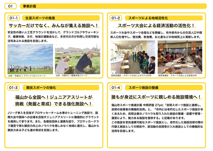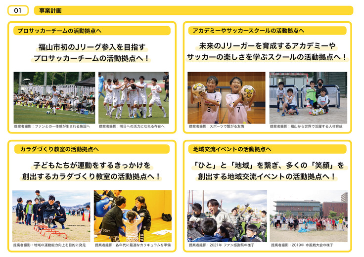 そこでは、福山シティFCのみならず、地域の子ども達が全力でボールを追いかけ、近い将来このグラウンドから未来のJリーガーや日本代表選手が輩出されるかもしれません。また、生涯スポーツを楽しめる環境として、備後エリアや福山市民の健康寿命の向上にも貢献できると自負しております。