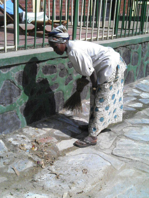 でもルワンダ、あるいはアフリカ地域(多分)では、こうしたいわゆる竹ぼうきの先っちょ部分のみの箒で、腰をかがめて掃く。だから腰が直角に曲がっているのですね。