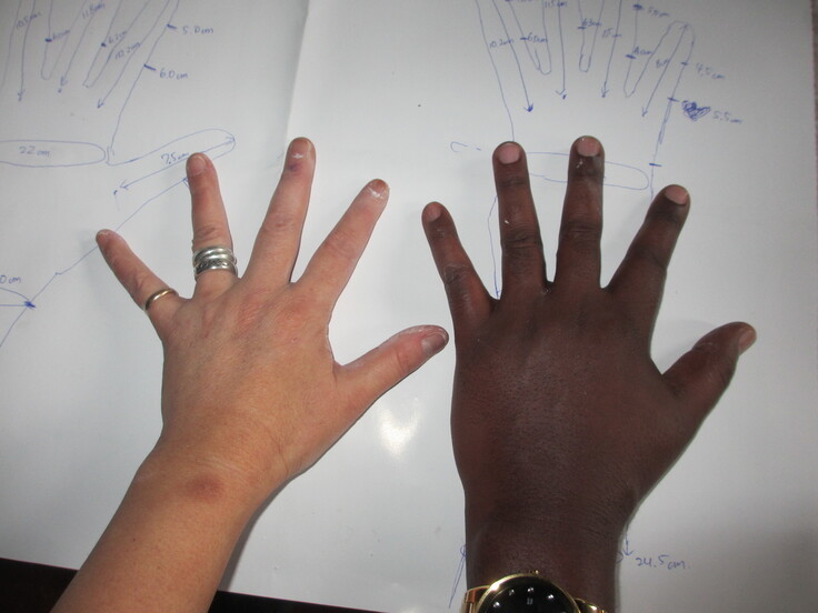ルワンダの人の肌の色は、ほとんどの場合日本の人のそれよりも焦げている。それを伝えるために、患者さんの手と私の手を並べて写真を撮り、日本の会社にその写真で判断してもらうのだ。