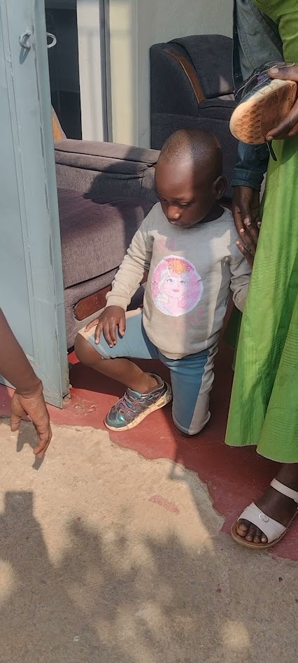案の定、しばらくしたらその子は泣き止んで、義足に関心を持ち始めた。だから、今だっとばかりに義足を履かせてみる。