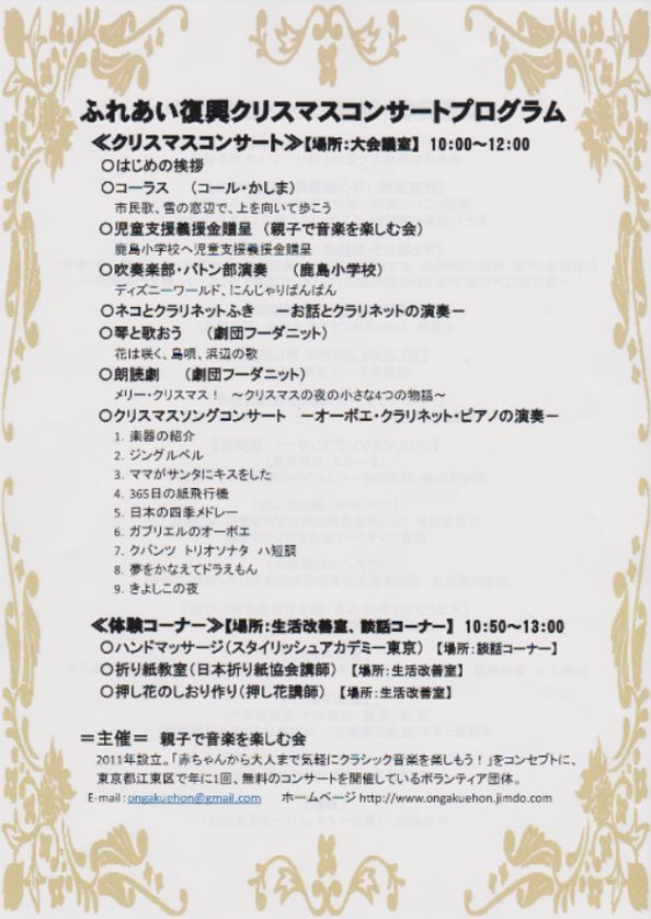 12月18日(日)万葉ふれあいセンターにおいて「音楽の絵本 IN 福島ふれあい復興クリスマスコンサート」と題してコンサートを開催して来ました!お年寄りから子供まで大勢の方々に音楽を聞いて頂き沢山の笑顔を見る事が出来ました。皆様の応援のお陰です。