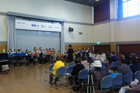 会場前でスタッフ全員集合しました。 鹿島小学校吹奏楽部の演奏です。