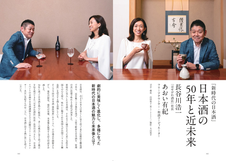 さらには全10ページにわたる奥田透と杉田孝明(日本橋蛎殻町すぎた)、前平智一(てんぷら前平)との創刊記念座談会記事や、長谷川浩一 (はせがわ酒店)とあおい有紀(フリーアナウンサー・和酒コーディネーター)による対談記事なども掲載。