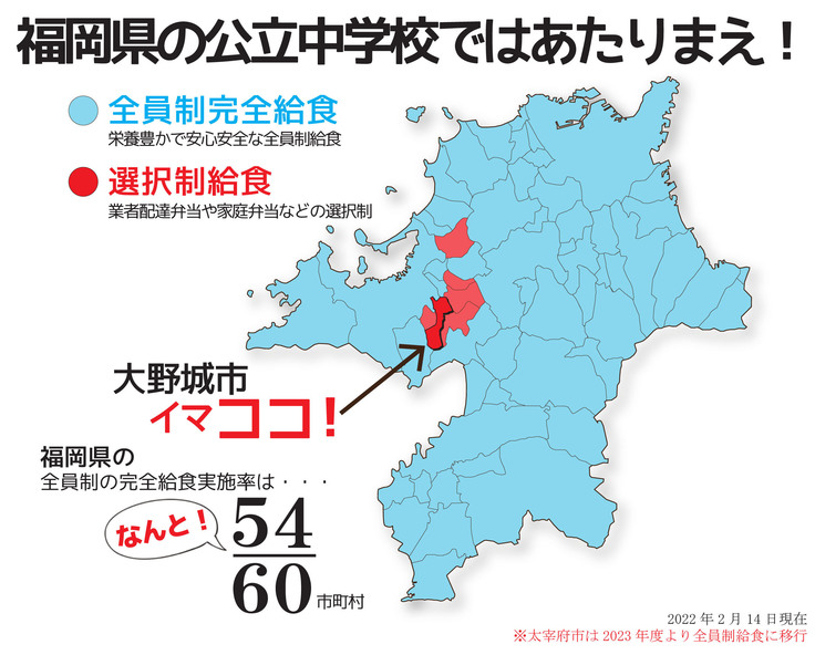 福岡県でも全国でも、公立中学校における全員制完全給食はあたりまえです。大野城市立中学校に通う約3000人のみんなに、できたての小学校のような給食を実施するのはそんなに大変なことなのでしょうか。