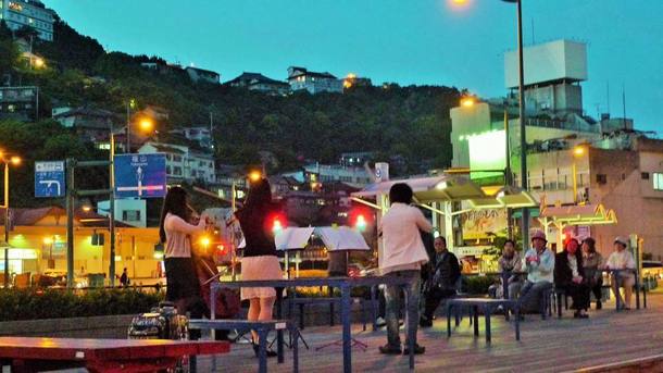 - 駅前の、海のそばのデッキ