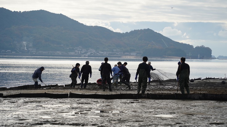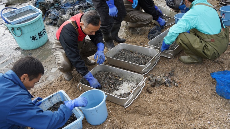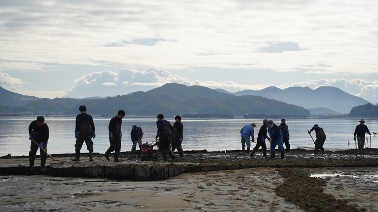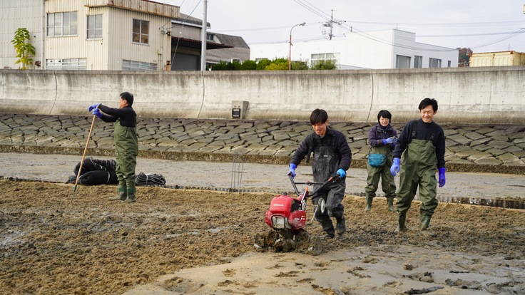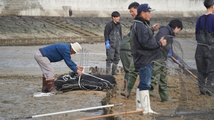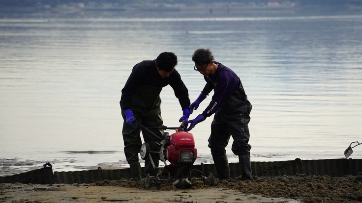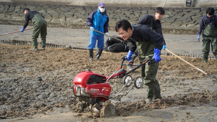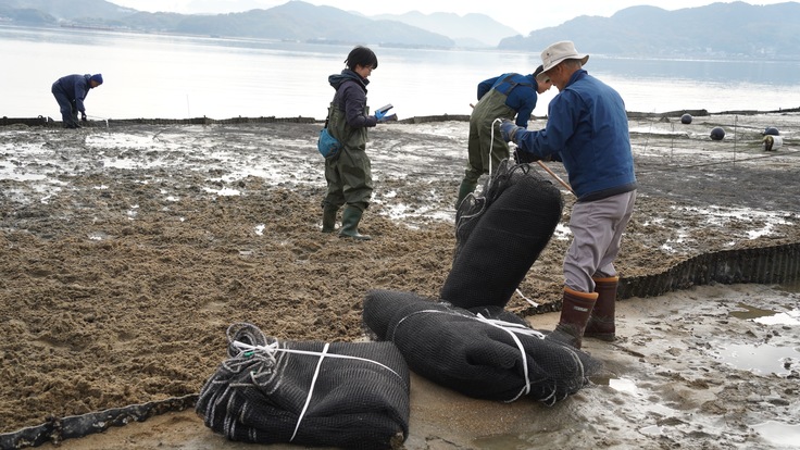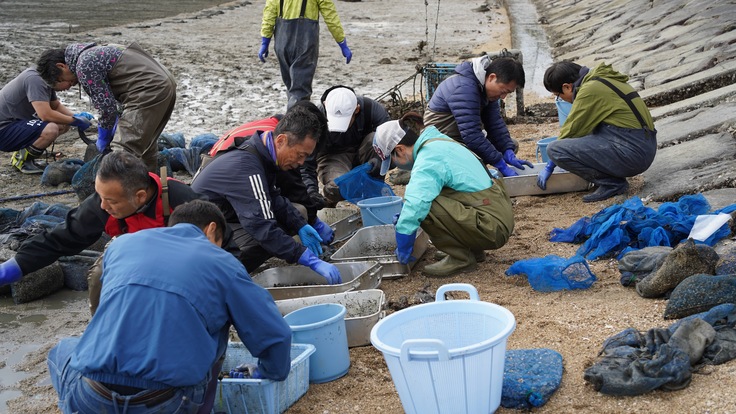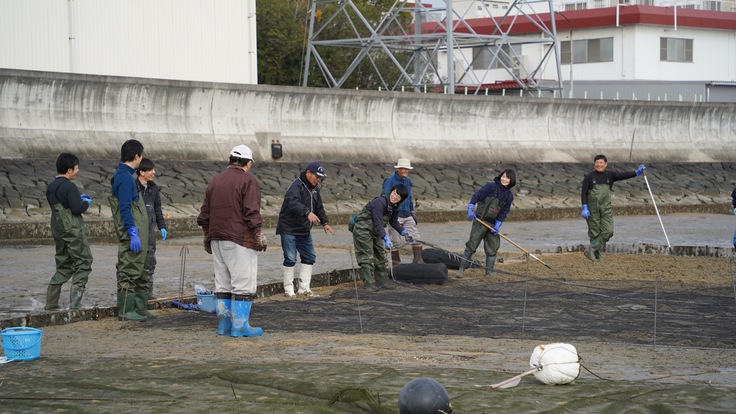 冬の朝でしたが風もなく、温かい日差しが降り注ぐ中、写真にあるように稚貝の選別や、干潟の耕うん、更には稚貝を撒いた上での網掛けを実施しました。