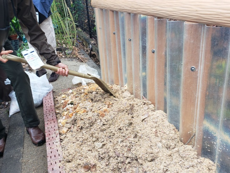 「コンポスト」とは、生ごみなどを微生物の働きで発酵・分解させ、肥料にしていく仕組みです。昨年は、「京都音博」ができる“環境”にやさしい取り組みとして、「資源が“くるり”プロジェクト」を掲げました。そのひとつとして、「フードエリアで出る食材の使い残しや食べ残しを堆肥に変え、梅小路公園の指定管理者である京都市都市緑化協会にお預けして、公園樹木の肥料にする」という「コンポストプロジェクト」を、梅小路まちづくりラボほか地域団体のみなさまとのご協力とともに、スタートいたしました。