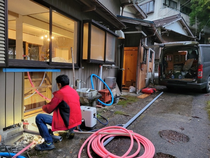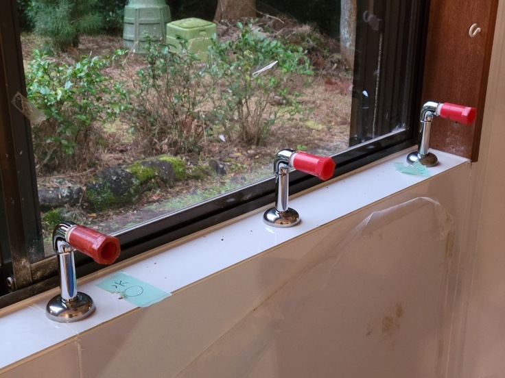 先日、移転先の神埼よってちょで、キッチンの水道工事がおこなわれました。窓の目の前に、ピカピカの3本の水道ができました〜