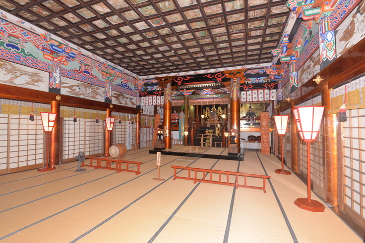 奥宮は、奥から本殿、幣殿、拝殿を連結して一体にし、拝殿の左右両側には長廊と呼ばれる長大な部分が取り付いた複合社殿で、他に類を見ない壮大な社殿です。内部は極彩色の柱、234枚の花草が描かれた天井画、天井下三方の壁には、天人の天翔る極彩色絵が描かれ絢爛豪華な造りとなっています。